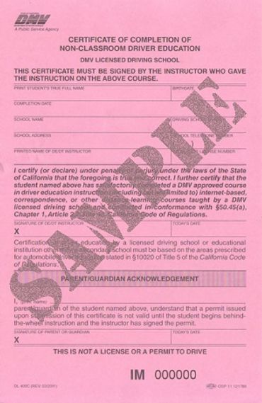 Our online course is approved by DMV and driving school association and satisfies the 30 hours requirement by the DMV . To Register click this link. Online Driver's Ed Once the course is completed, you will receive a completion certificate. (Pink color, see sample below)