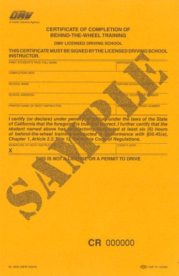 Minors are required to take 6 hours of behind-the-wheel training with an instructor. The permit that you obtain from DMV is not valid until you start your training with a Licensed Instructor. After the first lesson (2 hours) your permit will be signed which enables you to also practice with your parents or a licensed driver 25 years of age or older with a valid California license. Upon completion of the 6 hours, you would receive a completion Certificate. (Orange color, see sample below)